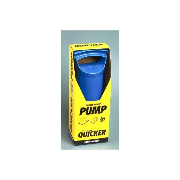 Luftpumpe Quicker er en dobbeltvirkende fodpumpe, hvilket betyder, at den pumper luft igennem slangen både når der trækkes og trykkes. Slangen og reduktionsnippel er på 6/11 mm.