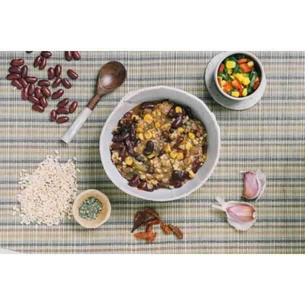 - Hakket oksekød tilberedt med kidney bønner, majs og en blanding af rød og grøn peber serveret med fuldkornsris