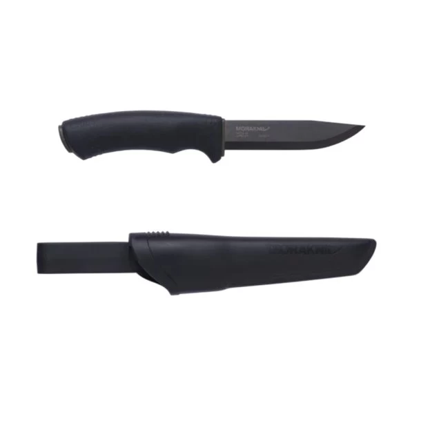 Bushcraft BlackBlade Kniv fra Morakniv kommer i en skede med en bælteløkke og klips, så din kniv altid er lige ved hånden.