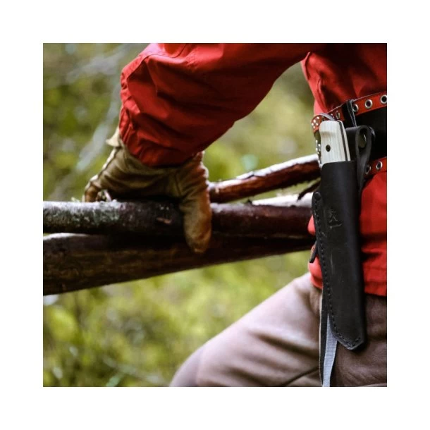 Det sorte knivblad lavet af genanvendt svensk rustfrit stål sammen med dens fulde krumning og drop point-spids giver dig mulighed for at få mest muligt ud af din oplevelse. Ryggen på bladet er slebet, hvorfor du kan bruge denne model med en ildstarter, hvilket kan være en vigtig ledsager på din tur.