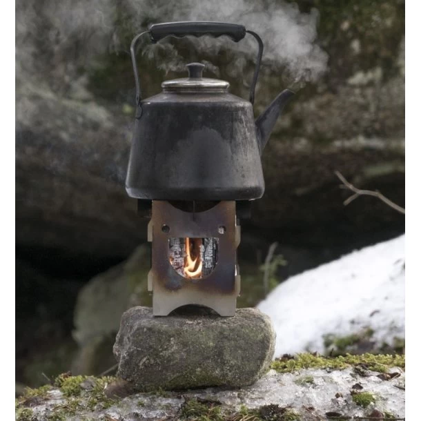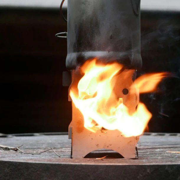 Happy Stove består af 7 laserskåret rustfrie stålkomponenter: tre sidevægge, en bund, et “glad ansigt” og gryde/pande holder i to sektioner. Når du har klikket siderne på plads, er ovnen klar til brug. Designet til tung vægt, holdbarhed og balance. På trods af den lave vægt kan ovnen nemt klare vægten af en normal kaffekande. Den leveres med en beskyttende taske fremstillet af 1000D Cordura. Når komponenterne er pakket i tasken, fylder det minimalt.