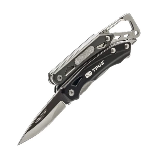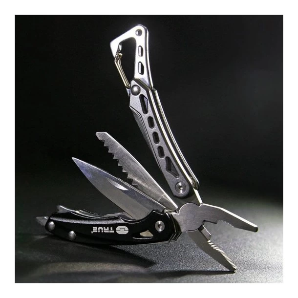 SEVEN Multi-Tool fra True er særdeles alsidig med en masse funktioner heriblandt: ergonomisk håndtag, indbygget karabinhage, ikke-låsende kniv, ikke-låsende sav, tang, trådskærere, Phillips skruetrækker og flaskeåbner.